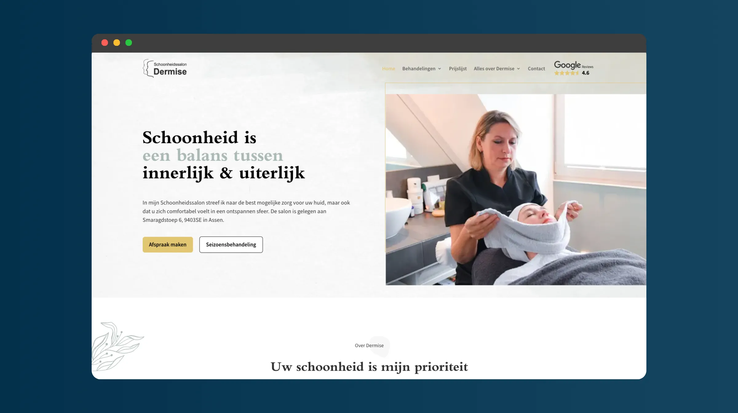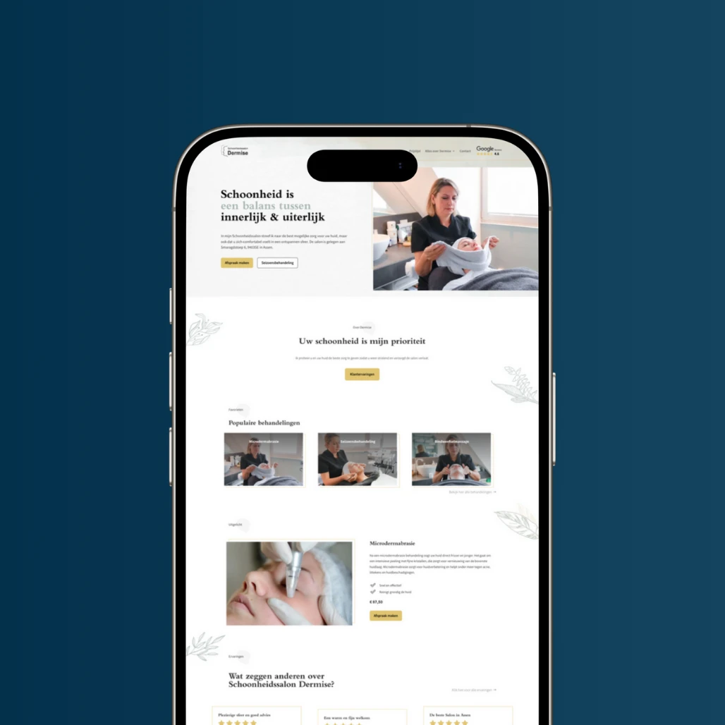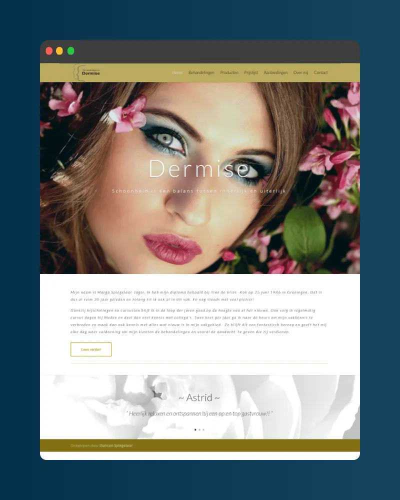 Schoonheidssalon Dermise is een gerenommeerde salon in Marsdijk, Assen. Dit is de salon van mijn moeder, waardoor dit project een kleine bias heeft. Het huidige webdesign is een herontwerp van mijn allereerste echte website uit 2018. Onderaan deze pagina vind je een before-and-after slider om het verschil tussen het oude en nieuwe ontwerp te zien.