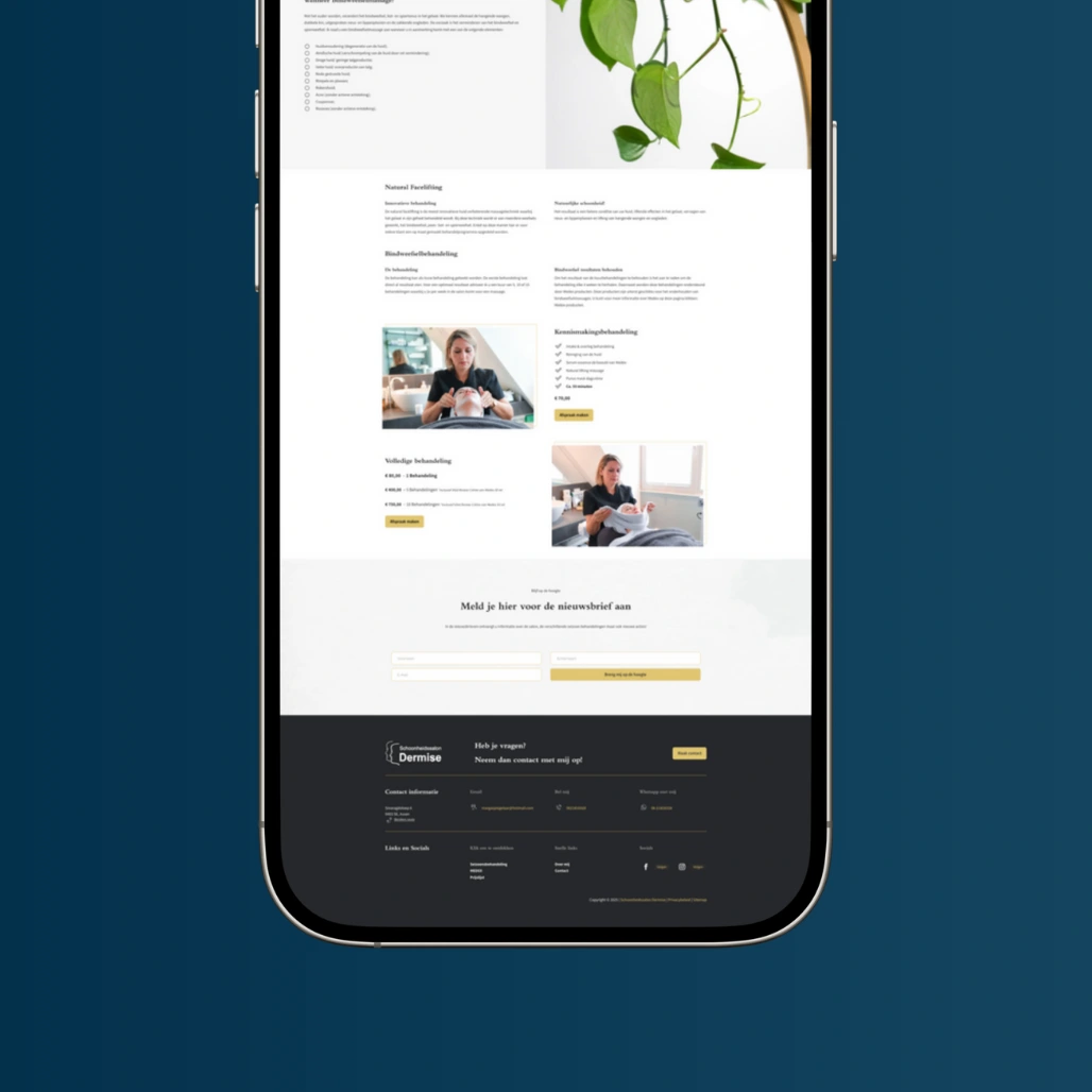 Het doel was om een rustgevende en ‘zen’-uitstraling te creëren, terwijl de website ook helder en gebruiksvriendelijk blijft. Klanten moeten eenvoudig de prijzen en behandelingen kunnen vinden. Schoonheidssalon Dermise werkt nauw samen met Medex en biedt diverse behandelingen en producten die binnen hun marketingstrategie passen. Een belangrijk onderdeel van het ontwerp is de pagina over bindweefselmassage, waarvoor ik een zoekwoordenonderzoek heb uitgevoerd om de vindbaarheid te optimaliseren. Dit project combineert design, gebruiksvriendelijkheid en SEO-optimalisatie om een professionele en toegankelijke website te creëren.